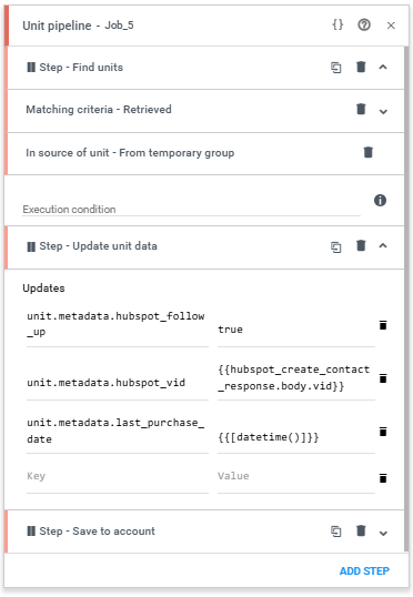 At the same time, we create a unit on the Bosbec account where we save the user’s email, the ID they received in Hubspot, and the current date so we know when the last purchase was made. We also set metadata indicating that the unit should be exported.