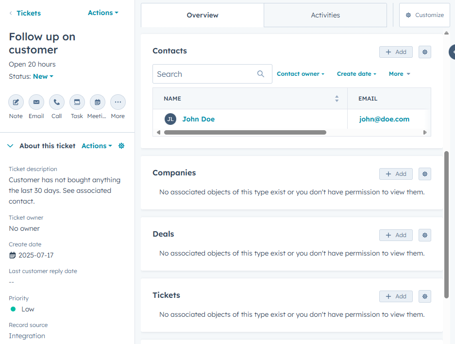 - Create a ticket in Hubspot — linked to the customer — if no new order has been received within a certain number of days.